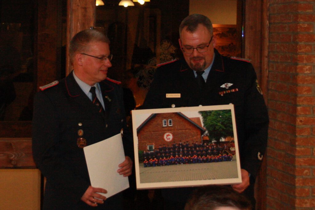 Der ehemalige Ortsbrandmeister Horst Kirsch für seine langjährige Tätigkeit in der Feuerwehr Hordorf mit einer Ehrenurkunde und Präsenten verabschiedet.
